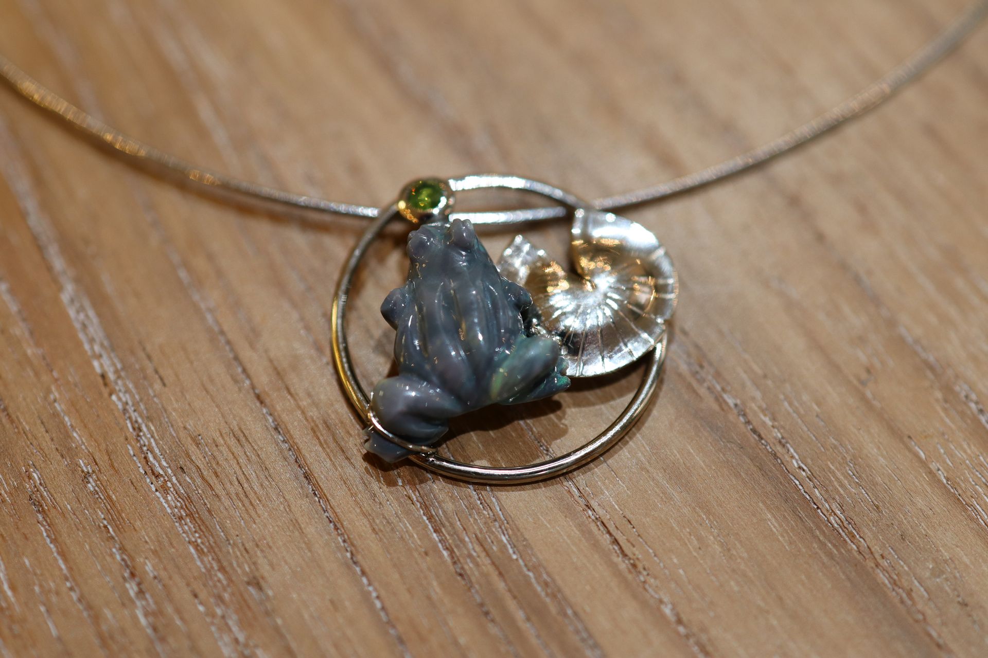 Weißgold 585/- mit grünem Diamant und geschnitztem Frosch aus Vollopal